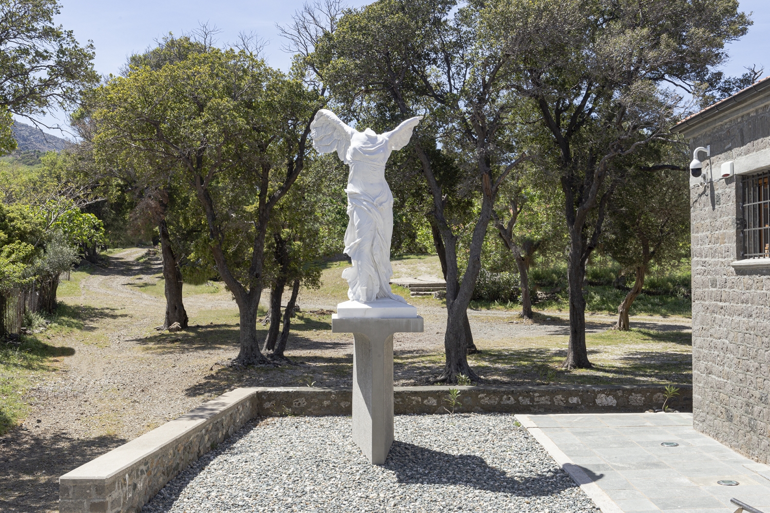 Marble (Thasian marble) exact copy of the statue of the carved from Parian marble winged Nike of Samothrace discovered at the Sanctuary of the Great Gods in 1863 by the French diplomat Charles Champoiseau. Τhe statue consist part of a monument and Nike has just alighted on the prow of a tetreres or quadrireme, a warship of the period of the dedication of the monument (first half of the 2 nd cent. BC) The patron-dedicator of the monument and its sculptor/sculptors remain unknown. The original monument in its complete form (socle, prow, statue) is exhibited in the Louvre. The latter allowed the use of its 3-D Scanning of the monument for the production of two copies, one for Alexandroupolis – one for Samothrace, by the Region of Eastern Macedonia & Thrace through the initiative of the late Regional Governor George Pavlidis. The copies were produced and offered to the Region by F.H.L. I. KIRIAKIDIS Marbles – Granites S.A.